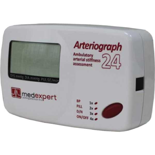 The Medexpert Arteriograph-24 IrDA is an ambulatory blood pressure monitor. Medaval has not found evidence proving the accuracy of its blood pressure measurement technology. Blood pressure measurements are taken from the upper arm. It is intended for ambulatory blood pressure monitoring.