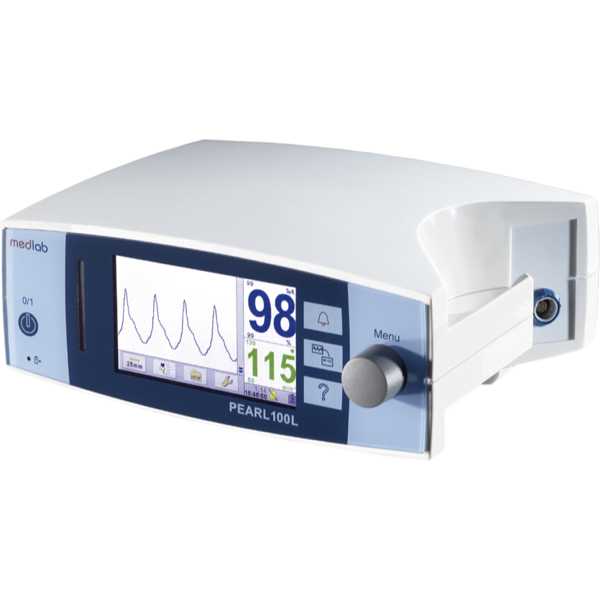The Medlab Pearl 100L is a desk (tabletop) automatic pulse oximeter. Information regarding the accuracy of its oxygen saturation measurement technology does not appear to be available. Oxygen saturation measurements are taken from the finger. It is intended for professional use.