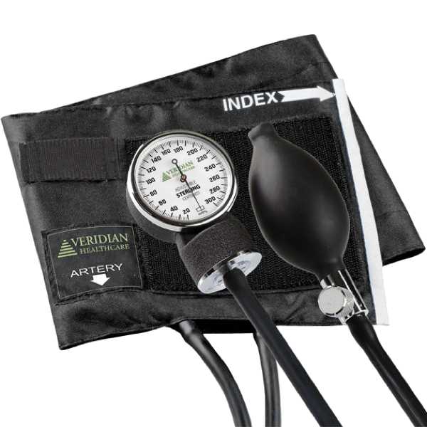 The Veridian 02-103 Sterling (Series) is a hand-held manually-operated aneroid sphygmomanometer. Blood pressure measurements are taken from the upper arm. It is intended for professional use.